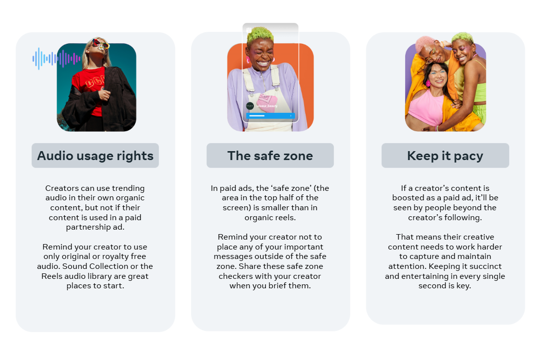 Audio Usage Rights: Creators can use trending audio in organic content, but not in paid partnership ads. Remind them to use only original or royalty-free audio. Sound Collection or the Reels Audio Library are great starting points.